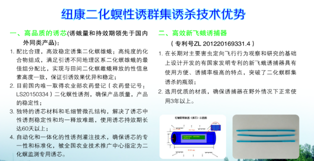昆虫性诱剂产品是仿生高科技产品,通过诱芯释放人工合成的性信息素化合物,并缓释至田间,引诱雄蛾至诱捕器,并用物理法杀死雄蛾,从而, 破坏其交配,最终达到防治的目的。宁波纽康生物技术有限公司开发的二化螟化学信息素产品,引诱力强,防治效果明显,使用简便,价格合理。诱杀效果优于目前国内同类产品,已成为国家农业部农业技术推广中心的推广产品。